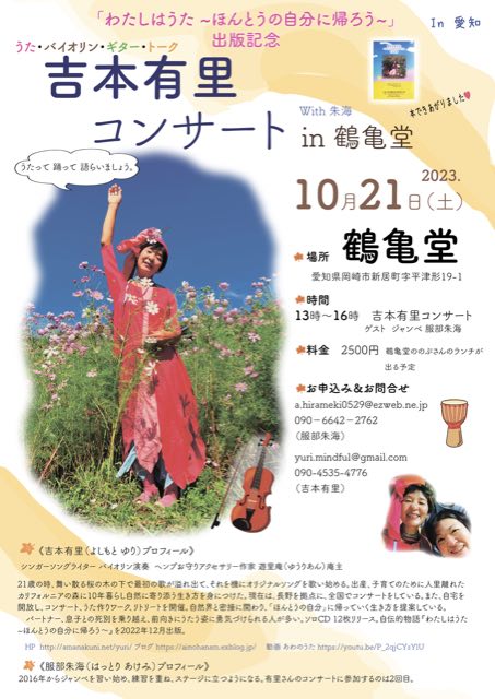| 2023/10/21 | 愛知 | 吉本有里 コンサート With 朱海 In 鶴亀堂 ~『わたしはうた・ほんとうの自分に帰ろう』出版記念~ チラシ 場所 鶴亀堂 愛知県岡崎市新居町字平津形19-1 時間 13時~16時 吉本有里コンサート ゲスト ジャンベ 服部朱海 料金 2,500 円 ※ Live 前に鶴亀堂ののぶさんのランチが出る予定。 お申込み&お問合せ a.hirameki0529*ezweb.ne.jp(*→ @)/ 090-6642-2762(服部朱海) yuri.mindful * gmail.com(*→ @) / 090-4535-4776 (吉本有里) | |