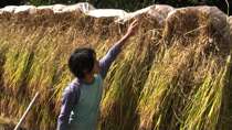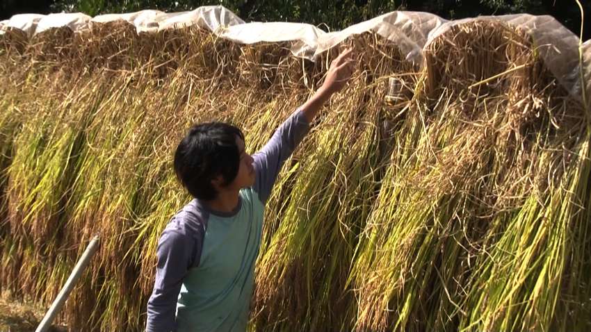 2012年秋、実った米の天日干し、はさがけ作業、次男の八星 |