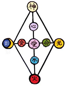 皆さんへの呼びかけのイメージを明確にしようと、「9つのキーワード、神、火、水、食、命、光、影、愛、心」を想い描いているうちに、全体が一つの図形に結晶しました。