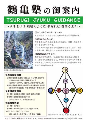 この間に様々な人に出会ったり、長年会っていなかったなつかしい人と再会したり、想いもかけぬ流れで日頃では全く交流のない業界の人と何時間も話しをする機会があったり、必要な情報をたずさえた本などが次々にやってきて、全体の流れが僕の中で発酵して、ジワッと沸いてきて、だんだん明確なイメージとして浮上して来たのが「鶴亀塾」の開催で、今までは山の暮らしで育んだメッセージを歌にのせて全国のファンの皆さんに届けていたのですが、言わば広く浅く伝え歩いていたということでした。これからは、僕は動かず(全くとは言いませんが基本姿勢として)逆に剣山の塾へ訪れてもらい、狭く深い現場体験型でメッセージをお伝えして行くということです。