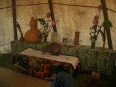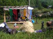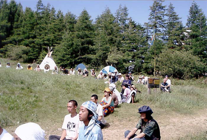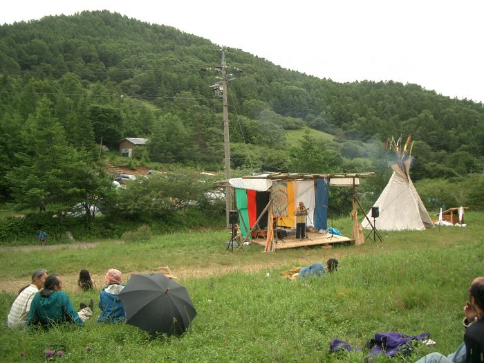 ステージとティピを見たところ。すぐうしろが入笠山の山頂です。