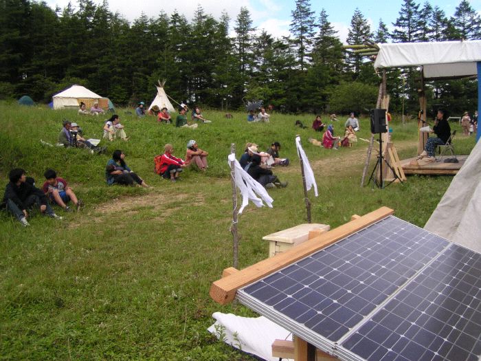 ステージのPAはソーラーの電力が使われていました。お話してるのは山田征さん。