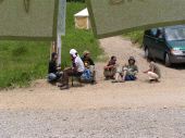 この日はよく晴れてあつくなり、山の上でも熱射病になりそうなくらいでした。お店の陰で休むボブとタカ。