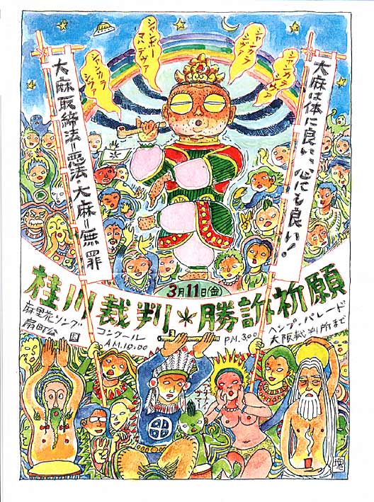 桂川控訴審の判決公判に向けて、関西勝手連は多彩なイベントを企画中である。ハイライトはなんといっても扇町公園から裁判所までの約1キロのヘンプ・パレードだ。集会やデモの規制がますます強化される昨今、いかに楽しく効果的なパレードが演出できるか、囚人桂川君の耳にも届くようなデモンストレーションをやってみたいものだ。