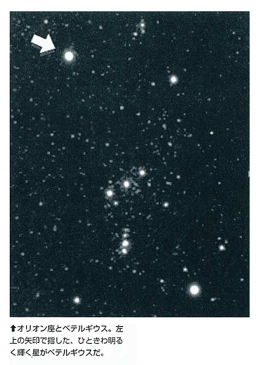 はたしてオリオン座の主星ベテルギウスは、2012年頃に超新星化して大爆発を起こすのか? そうなれば今から言われているように空に第二の太陽が現れたように見え、数週間の間、夜も空はベテルギウスの輝きで不思議に昼のように明るいという期間が続くことになるかもしれない。それは今から想像してみるだけで、まるでSF映画のシーンのようで、ゾクゾクしてくる。