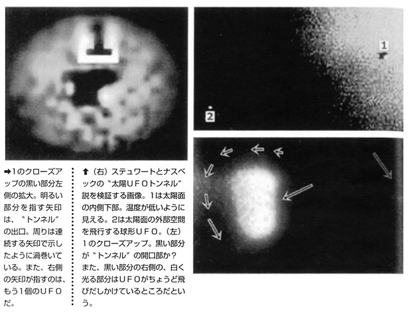 「惑星サイズの巨大UFOが太陽表面のコロナ中に一時的に開いた“黒いトンネル”から出現するところを確認できた」というのだ。分析レポート中で、問題のUFOをしばしば“エイリアン宇宙船”と呼びながら説明し、通常のモニター画面では、一見温度が周囲より低いので黒いだけのように見える部分が、実際には拡大すると白く光るUFOがちょうど飛び出しかけている“トンネル”の開口部だという。さらにステュワートは、“トンネル”内の暗闇の左すれすれに見える白っぽい楕円光はUFOではなく、実は黒い“トンネル”の一番奥、向こう側に開いた“出口”の光らしいと指摘する。さらにもっと部分をクローズアップを重ねて、その“向こう側の出口”付近の空間が「流動的に回転している」ように見え、また“トンネル”の暗闇中に「もう1個のUFOが移動しているようだ」とも主張している。