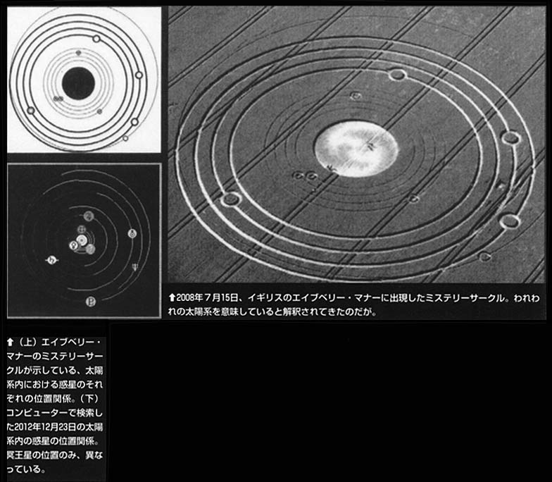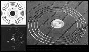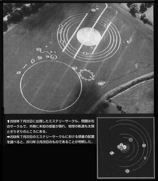 2008年7月15日、イギリスのウィルトシャー、エイブベリー・マナーに出現した一つのサークルがある。写真のように複数の輪で構成された図形になっているが、これは我々の太陽系を意味していると解釈されてきた。太陽を中心に、9つの惑星が円を描いているからである。ただ、不可解な点もあった。その一つは、各惑星の軌道が細い線で描かれたグループと太い線で描かれたグループ、二つに別れていたことである。具体的には、水星、金星、地球、火星、一番外側の冥王星の軌道が細い線で、木星、土星、天王星、海王星の軌道は太い線となっている。