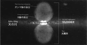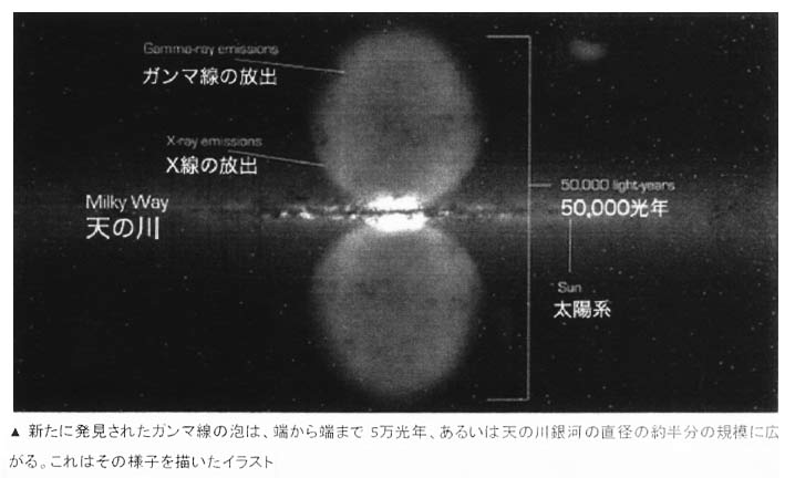 「2010年9月のNASAのフェルミガンマ線宇宙望遠鏡(観測衛星)から得たデータを基に、科学者は今、天の川銀河の中央が実に不思議な光で覆われていることに気づいた。その輝きの構造はどんなものか。銀河の中心部から上下2方向に放射する広がりを持つ、一対の巨大なガンマ線の泡のペアが噴出しているのが発見された。それぞれの“泡”の最長距離は、およそ2.5万光年と推測される。そして、全体としてのペアはわずか数千万年かけて形成されたものと見なされる」