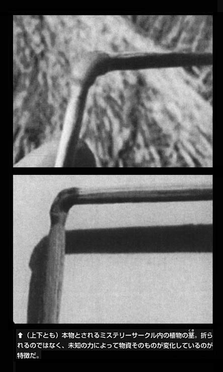 特に問題となるのが、茎の曲げられ方だ。「本物」とされるミステリーサークルでは、植物の茎は地面から1インチほど高いところで「折れる」のではなく、細胞、分子構造さえ変化させながら、「曲げられ」ている。したがってこの場合、植物は倒れても枯れることなく、収穫も可能となる。周囲に足跡が残されていないことも注目されるが、曲げられた茎の顕微鏡分析により、偽物とは区別されるというのだ。