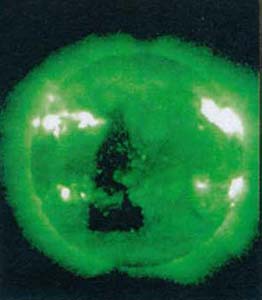 暗黒天体が出現した翌日の12日、さらなる異変が太陽に起こった。コロナの中に二等辺三角形の巨大な穴、つまり暗黒空間が現れた。しかもこの暗黒空間は、緯度と経度が共にゼロに合わさる形で現れていた。どう見てもこれは尋常なコロナホールではない。