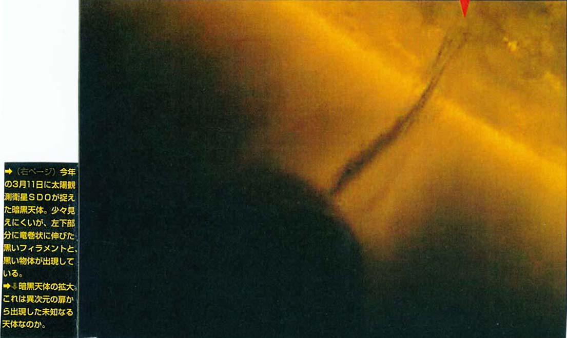 太陽表面からドス黒いフィラメントのようなものが湧き上がり、竜巻のようになって、一気に昇っていく様子が写っている。注目を集めたのは、その先に現出している物体である。そのフィラメントとリンクしながら、太陽から離脱していく黒色の球体が、そこに存在しているのだ。大きさは木星とほぼ同じで、太陽からの光を反射しない暗黒天体は、見るからに不気味さを感じさせる。