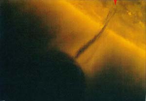そして6月17日、この暗黒天体がまたしても出現した。それは3月11日のケースと同様のものだった。太陽表面に黒い竜巻状物質が出現。それに連なるように巨大な球状の暗黒物体が現れたのだ。