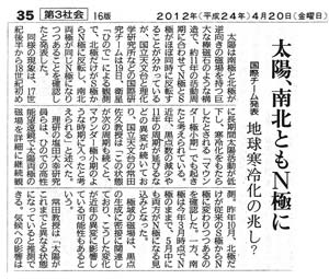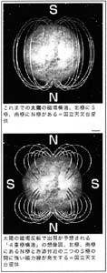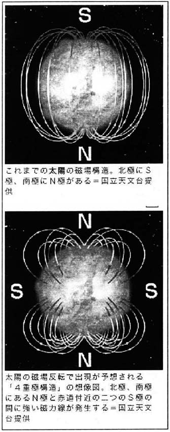 ―「国立天文台などは19日、5月にも太陽の磁場が反転し、北極と南極にN極(プラス磁場)、赤道付近に2つのS極(マイナス磁場)が出現する〈4重極構造〉に変化するとの予想を発表した。同天文台の常田佐久教授(太陽物理学)らは、太陽観測衛星『ひので』を使い、磁場データを分析。昨年7月以降、北極の磁場がS極からN極に反転し始めたことを確認した。一方、ほぼ同時に反転するはずの南極はN極のままで変化せず、4重極構造が確実視される状況となった」