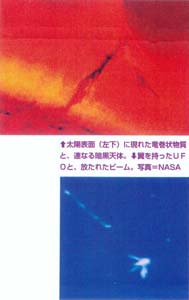 さらに太陽の周縁では、奇妙な巨大UFOも出現し続けている。6月1日には、翼のようなものを広げたUFOが、欧米の宇宙開発機関の協力を得て開設された太陽観測サイト「Helioviewer.org」の太陽画像から確認された。続いて6月3日には、NASAの太陽観測衛星「SOHO」が、同様に航空機を思わせる翼を持ったUFOをキャッチ。しかも、このUFOから放たれたかのように、一本のビームが延びていた。