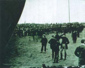 少年の向こうには長いスカートの女性が佇み、銃や軍旗を巻いた旗竿らしいものを抱えた兵士たちが整列し、さらにその向こう、画面いちばん奥の右から左までいっぱいに、沢山の群衆が何重にも立っていて、どうやら演壇とおぼしきものを取り囲んでいるようだ。