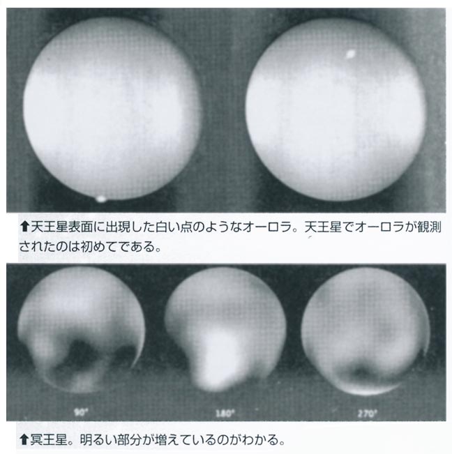 さらに同年11月、2度にわたって、太陽から約28億キロ離れた天王星の青緑色の表面に、史上初というオーロラが観測され、ハッブル宇宙望遠鏡が撮った画像が公開されている。地球に現れるカーテン状のものとは異なり、白い点状である。