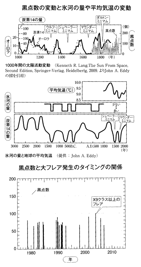 京都大学の柴田一成教授は、「黒点が少ないと寒冷化し、多いと温暖化したことが経験的に知られている」と話す。17世紀の「マウンダー極小期」と呼ばれる時期には、黒点は数年で1個ほどしか見つからなかった。この間の平均気温は現在より0.6度ほど低かったと推定され、英国ロンドンのテムズ川が凍った絵が残っている。