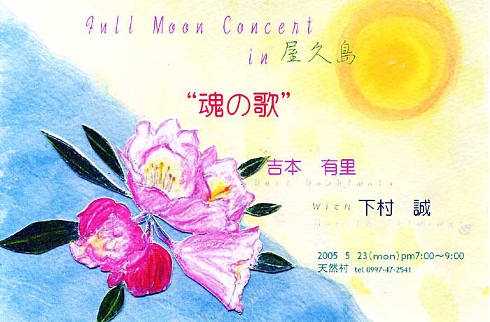 天然村(屋久町高平) 午後7〜9時 チケット 前売2500円 当日3000円 (島の住人 特別感謝価格)前売1500円 当日 1800円 中高生 700円 小学生 500円 お問い合わせ(天然村)0997-47-2541