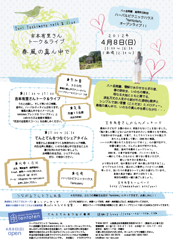 | 4月8日(日) | 山梨 | 「春風の真ん中で」吉本有里ライブ →チラシ ライブ真ん中に ハーブティとおやつタイム、終わってからシェアリングタイムがあります ★会場 ten to ten 〒408-0017 山梨県北杜市高根町五町田1412-1 ハーバルピクニックハウスtentoten tel & fax / 0551-45-9575 mail / info@ten--to--ten.com 12時半開場 13時開演 ★前日までの予約制(当日受付はなし)3300円 ★定員 15名 ★お申込み&お問い合わせ ombmaiko-w@xiao-d.com (まいこ) |