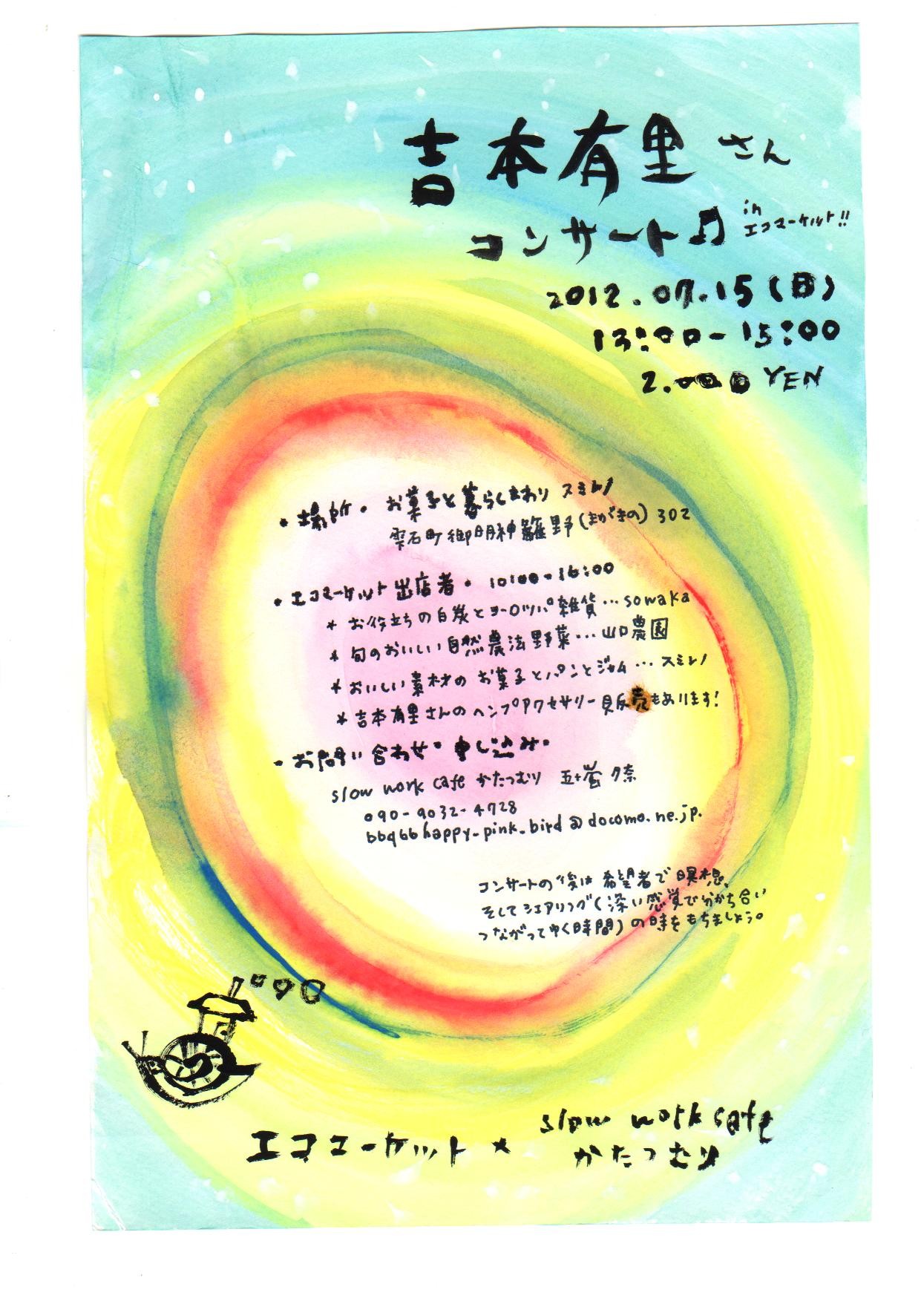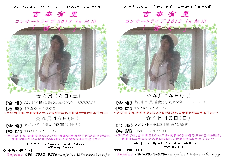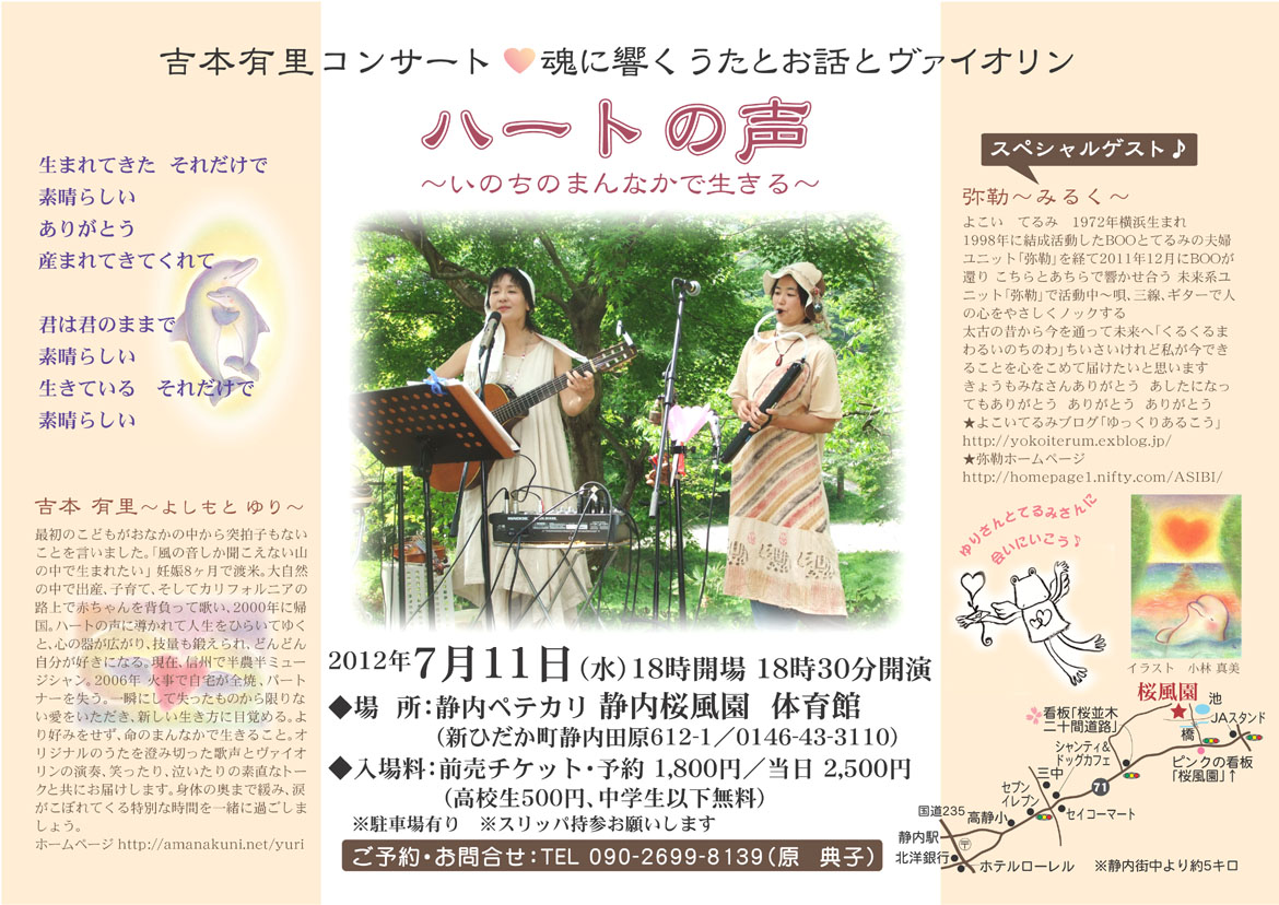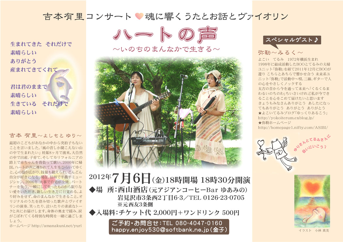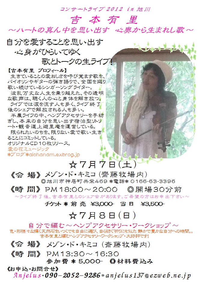 | 7月11日 | 北海道 | 吉本有里ライブ『ハートの声〜いのちのまんなかで生きる〜』(ゲスト よこいてるみ)