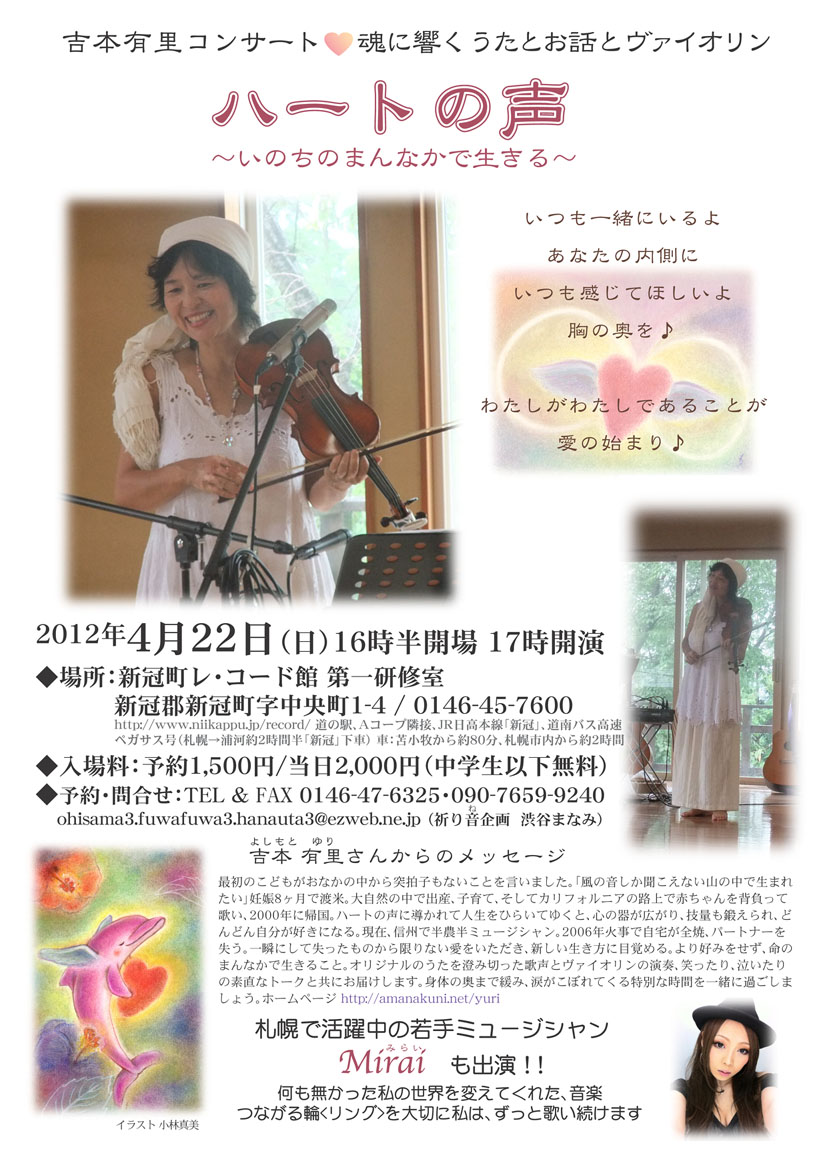 「ハートの声」 →チラシ 午後5時〜 【会場】 新冠町レ・コード館 研修室1 (電話 0146−45−7600) 新冠町字中央町1−4 ご予約&お問い合わせ 0146−47−6325 携帯09076599240(祈り音企画・渋谷まなみ)20時まで E-mail junjii_love2002@yahoo.co.jp |