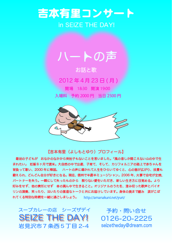 場所 ル・ムートンブラン(オーガニックの食事とケーキ) →チラシ 午後2時半開場 3時開演 予約 2000円 当日2500円 (飲み物 お食事は別途オーダーくだい) ご予約&お問い合わせ 0265-76-3737(ル・ムートンブラン) |