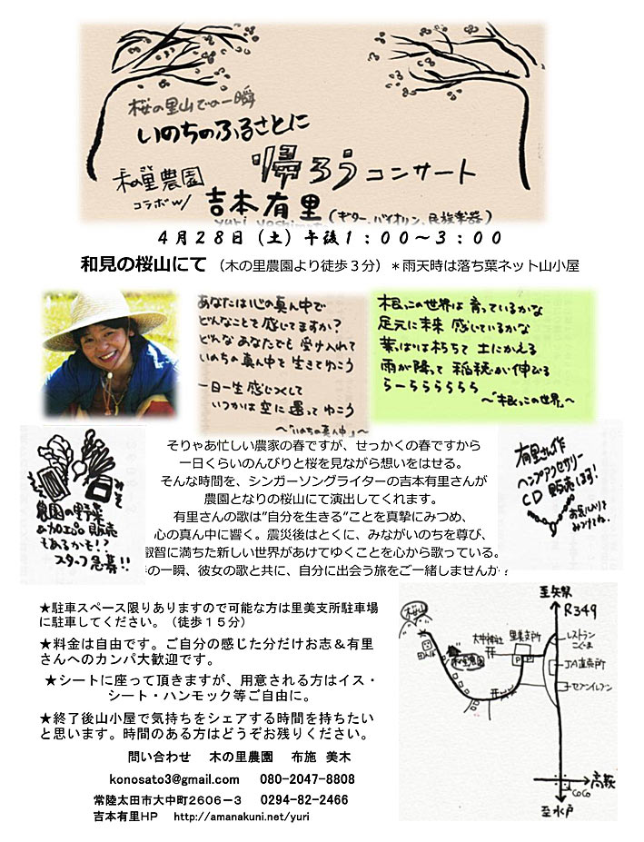 ゆめのなる木 ユーリー&てるみぃー コンサート → チラシ 場所 エックシュタイン・山小屋のガーデン(呉市郷原町) リベラルアーツカレッジ 時間 12時開場 午後1時開演 午後3時 交流会(参加自由) 料金 予約 2000円(当日 2500円) 中高生500円 小学生以下 無料 有里のCD,ヘンプアクセサリー、リベラルアーツカレッジの手作り品を販売します(草木染め、陶器、ジャム、ようかん、など) お問い合わせ&申し込み 080-5638-5673(岡田) yuko-omusubi@ezweb.ne.jp |