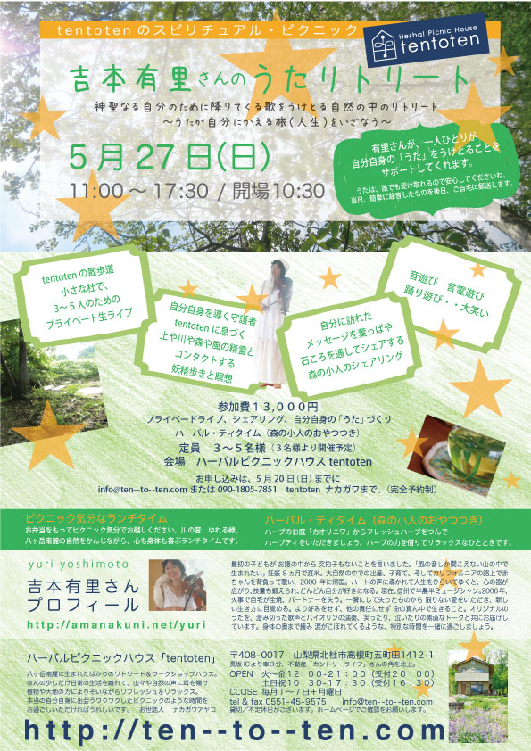 | 10月14日(日) | 山梨 | 吉本有里ライブ&ゆめのなる時間(定員18名) → チラシ 13:00〜16:30 (開場12:30〜) 参加費用 3600円 お問い合わせ&申込 tel & fax 0551-45-9575(中川) mobail 090-1805-7851 |