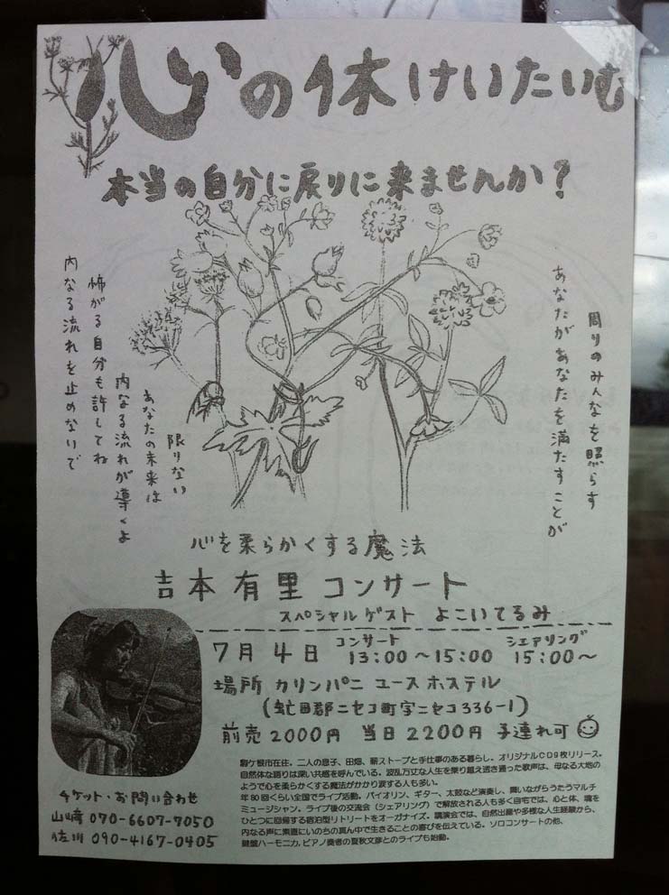 心の休けいたいむ 吉本有里コンサート →チラシ スペシャルゲスト よこいてるみ 場所 カリンパ二 ユースホステル (虻田郡二セコ町336−1) 前売り 2000円 当日 2200円 お問い合わせ&申込 070-6607−7050(山崎) 090-4167−0405(さがわ) |