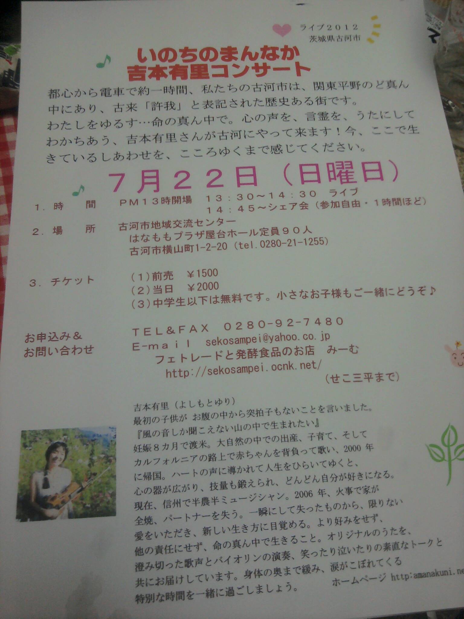 吉本有里コンサート →チラシ ◆時 間 13時開場 13:30〜 ライブ(約2時間) ライブ終了後〜シェア会(参加自由・1時間ほど) ◆場 所 古河市地域交流センター はなももプラザ屋台ホール定員90人 古河市横山町1-2-20(tel.0280-21-1255) ◆チケット (1)前売 ¥1500 (2)当日 ¥2000 (3)中学生以下は無料です。小さなお子様もご一緒にどうぞ♪ お申込み&お問い合わせ TEL&FAX 0280-92-7480 E-mail sekosampei@yahoo.co.jp フェトレードと発酵食品のお店 みーむ (せこ三平まで) http://sekosampei.ocnk.net/ |