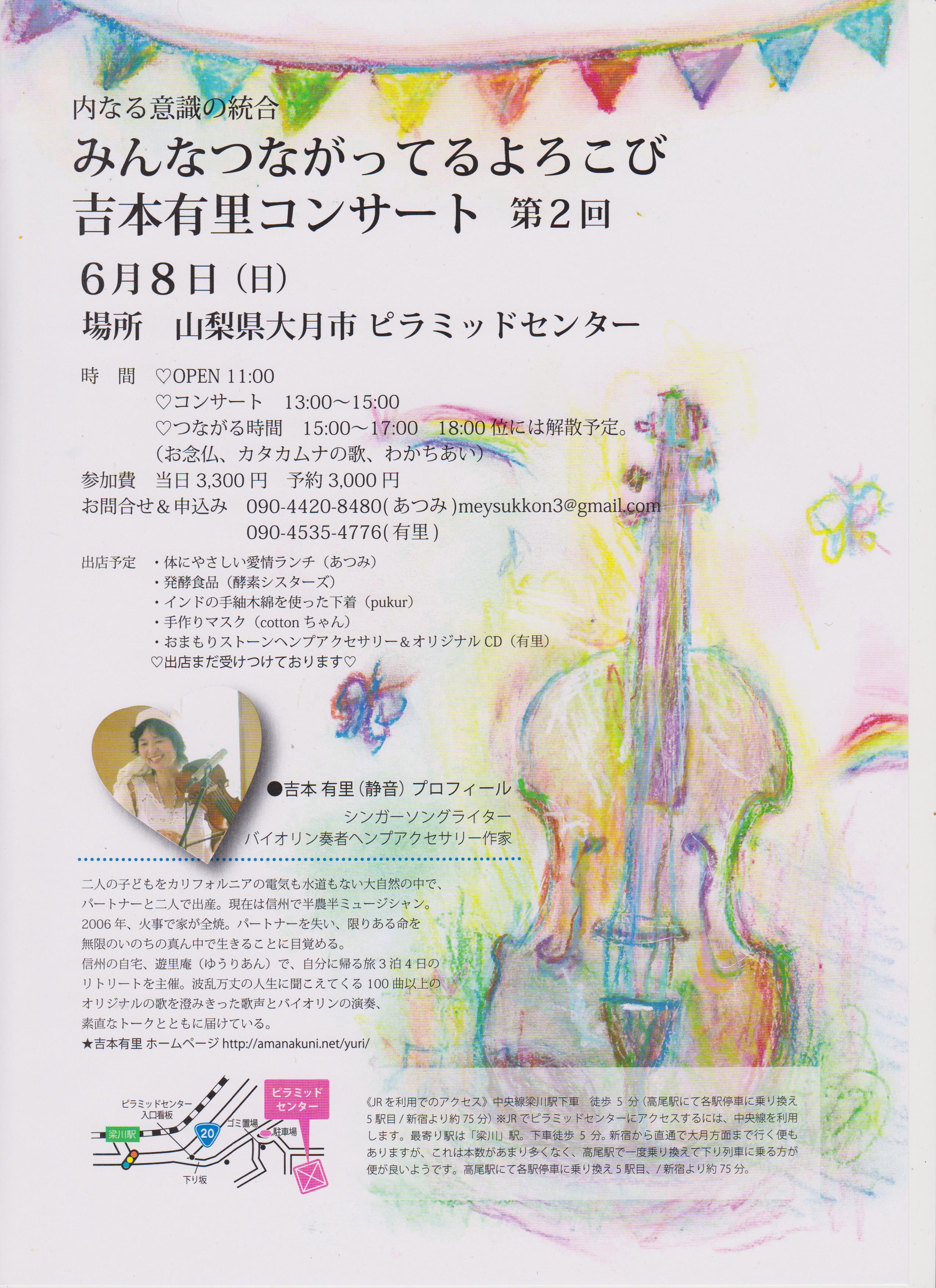 | 6月8日(日) | 山梨 | 大月市 →チラシ 内なる意識の統合 みんなつながってるよろこび 吉本有里コンサート 第2回 場所 大月市ピラミッドセンター 中央線梁川駅下車 徒歩5分 高尾で各駅停車に乗り換えて5駅目。新宿より 約75分 時間 オープン11時 コンサート 13時〜15時 つながる時間 15時〜17時(お念仏、カタカムナのうた、わかちあい) 参加費 当日 3300円 予約 3000円 お問合せ&申し込み 090−4420−8480(あつみ)meysukkon3@gmail.com 出 店予定 からだに優しい愛情ランチ(あつみ) 発酵食品(発酵シスターズ) インドの手紬木綿の下着(pukur) 手作りマスク(cottonちゃん) タロット(ちゃこちゃん) お守りストーン&ヘンプアクセサリーとオリジナルCD(有里) ※出店まだ受けつけてお ります |