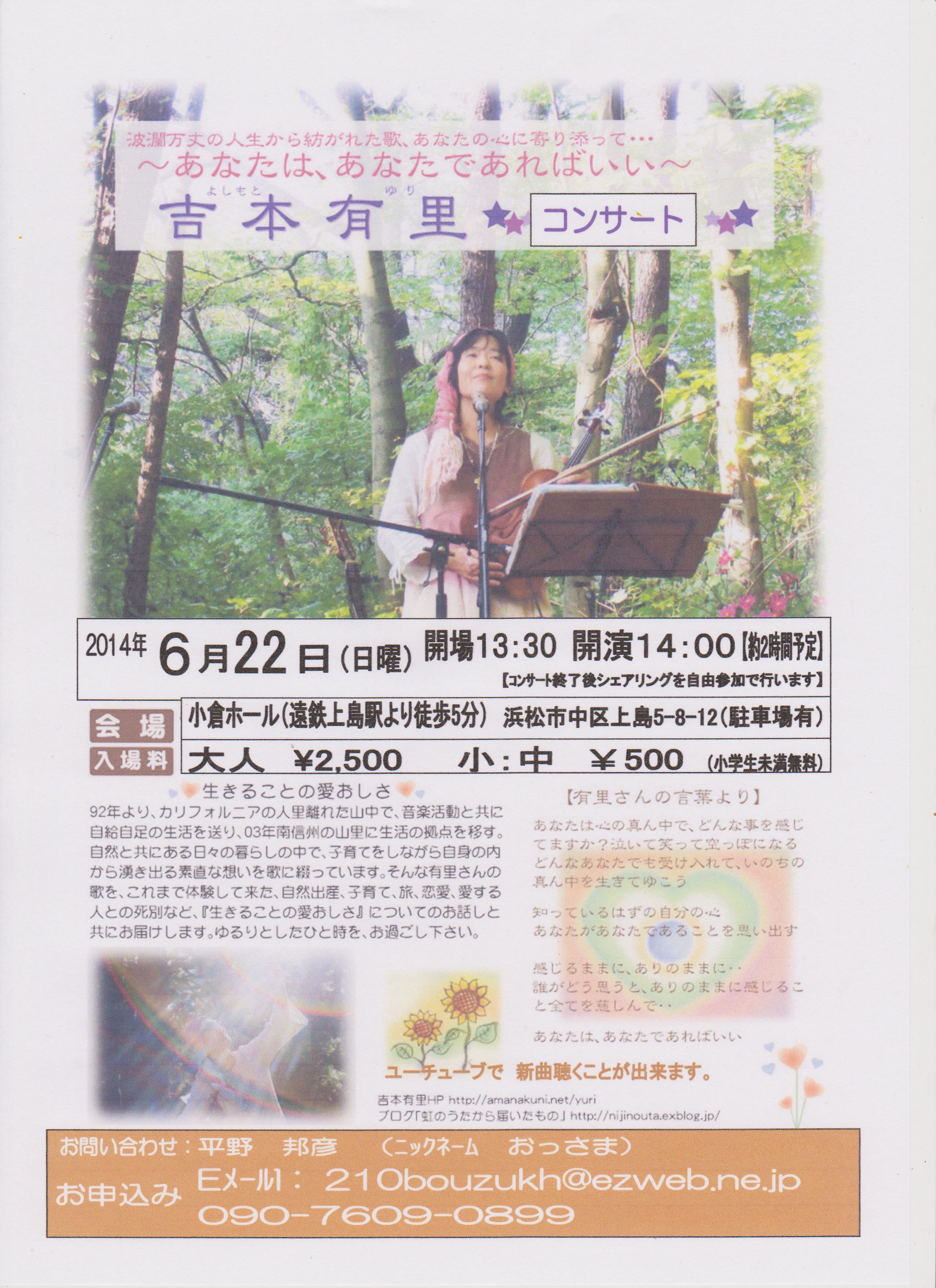 | 6月21日(土) | 静岡 | 袋井市 吉本有里コンサート →チラシ 会場 野草舎 2F 袋井市可睡の杜4−1 時間 開場 午後2時 開演 午後2時半 参加費 大人 2000円 中高生 1000 小学生以下 無料 申し込み 0538-48-8002(野草広場) |