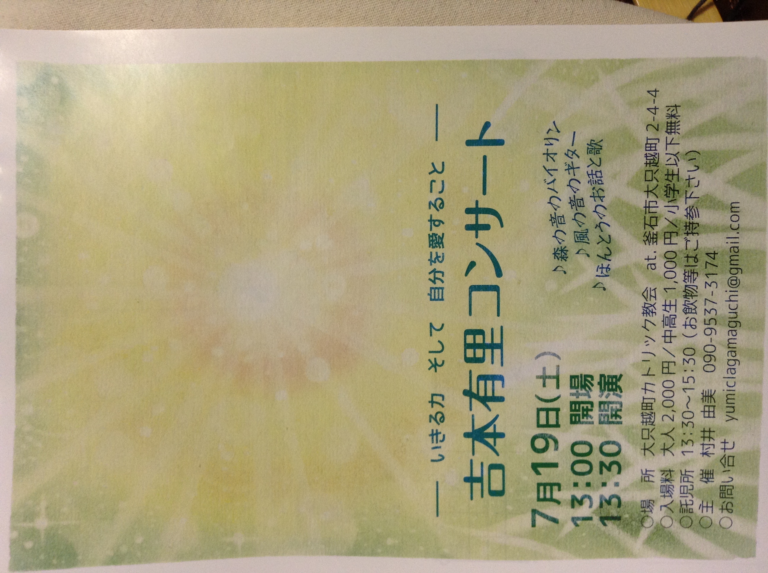 | 7月25日 | 茨城 | 那珂市 吉本有里コンサート →チラシ 会場 絵と音楽の空間 アトリエ浅田 時間 18時〜19時半(開場 17時半) |