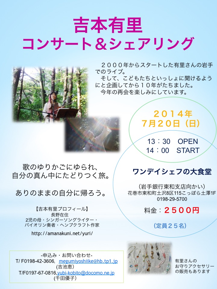 | 7月21日(月・祝) | 仙台・蔵王 | 吉本有里LIVE in Togatta 2014 あなたはあなたであればいい →チラシ |