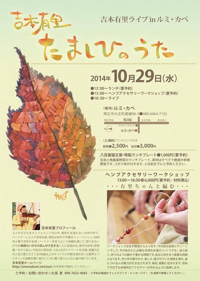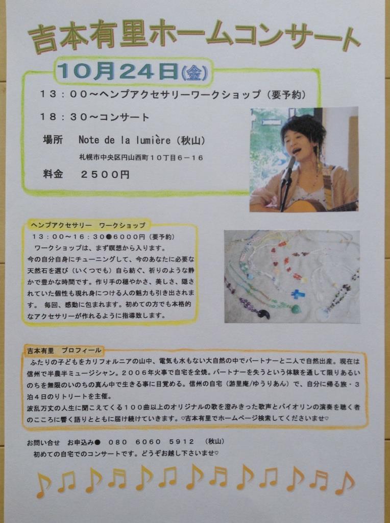 | 10月24日(金) | 札幌市 | 吉本有里 ホームコンサート&ワークショップ in札幌 →チラシ 場所 Note de lumiere (秋山)札幌市中央区丸山西町10丁目6−16 時間 午後1時〜4時半 ヘンプお守りネックレスワークショップ 午後6時半〜8時半 コンサート ワークショップはまず瞑想から。今の自分自身にチューニングして、必要なエネルギーの天然石をいくつでも選び、自ら紡ぐ祈りのような静かで豊かな時間です。作り手の穏やかさ、美しさ、隠されていた個性も現れて、感動に包まれます。初めての方でも本格的なアクセサリーが作れます。 料金 コンサート 2500円 ヘンプお守りワークショップ 6千円(材料費込) お問合せ&お申込み 080‐6060‐5912(秋山) 初めての自宅でのホームコンサートです。どうぞ、お越しくださいませ♪ |