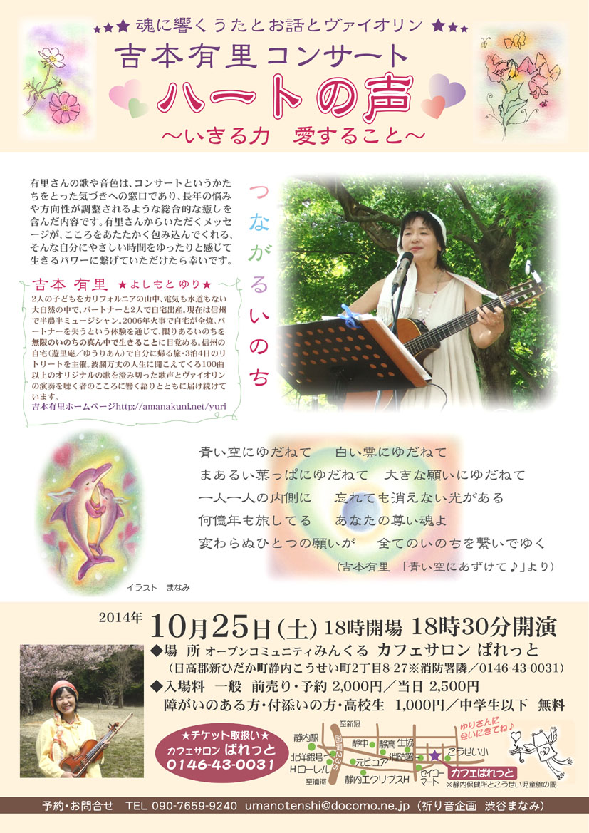| 10月25日(土) | 静内 | 『吉本有里コンサート ハートの声〜いきる力 愛すること〜』 →チラシ ◆日時:10/25(土) 18時開場、18時30分開演 ◆場所:みんくる内『カフェサロンぱれっと』/日高郡新ひだか町静内こうせい町2丁目8-27(こうせい小学校と消防署の間)/0146430031 ★チケット代:一般前売り・予約2000円、当日2500円。障がいのある方、高校生1000円、中学生以下無料 ★ご予約・問合せ:09076599240・メール〓umanotenshi@docomo.ne.jp(祈り音企画・渋谷まなみ) |