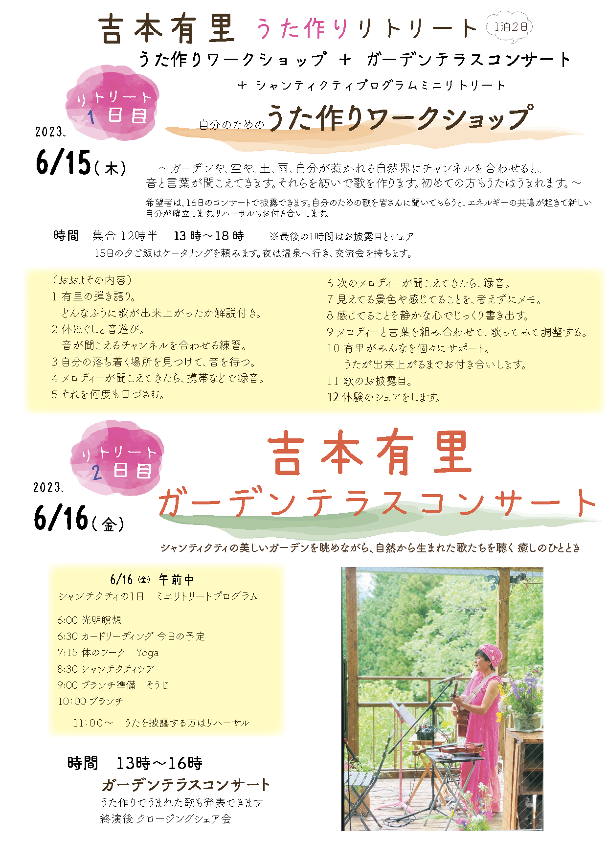| 6月15日(木)~16日(金) | 長野 | 吉本有里 うた作り リトリート1泊2 日 チラシ表 チラシ裏 |