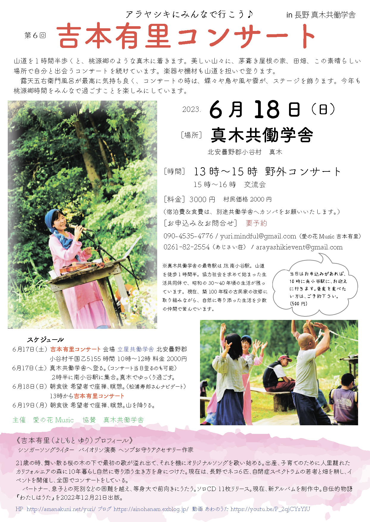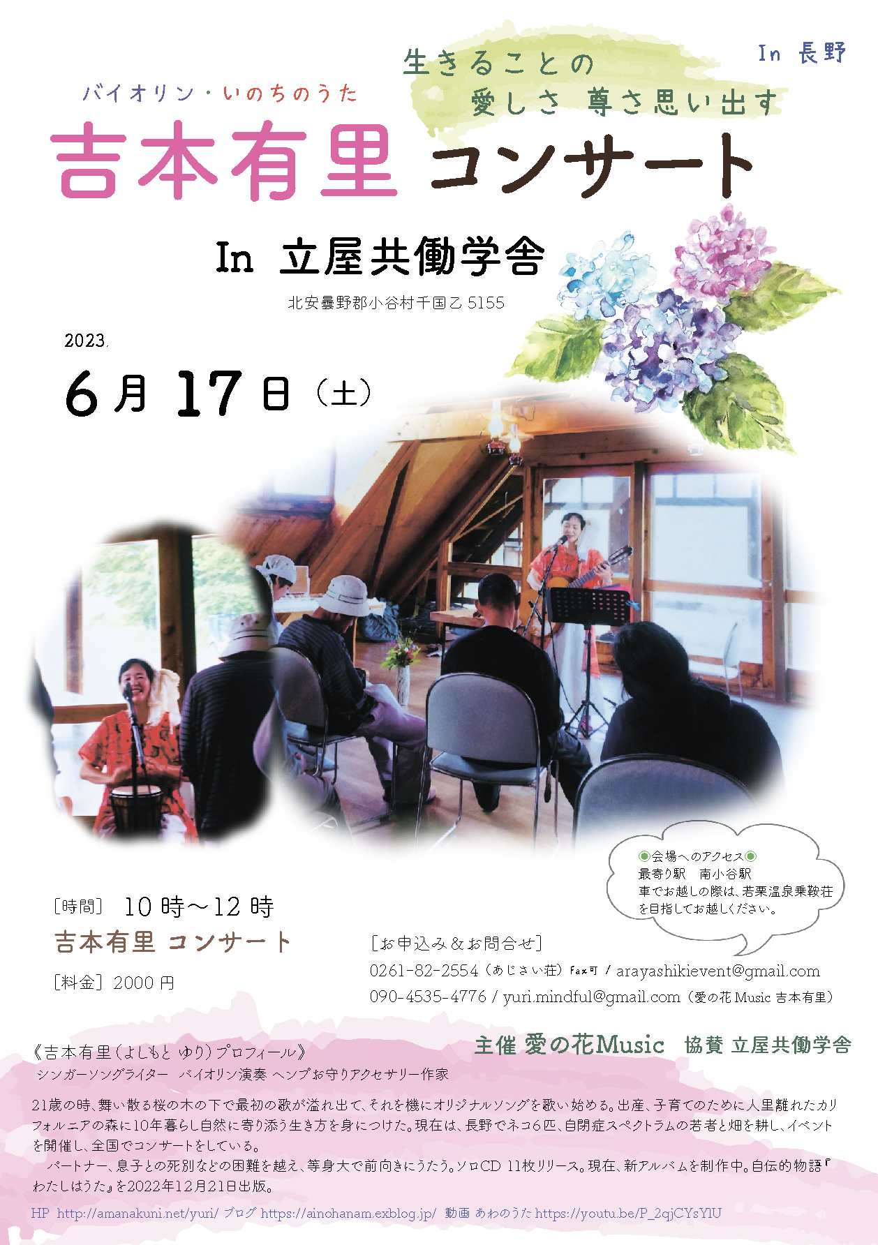 | 6月17日(土) | 長野 | 吉本有里コンサート 立屋共働学舎 チラシ 場所 立屋共働学舎 北安曇野郡小谷村大字千国乙5155 時間 午前10 時 吉本有里野外コンサート 料金 2,000 円 お申込み&お問合せ 090-4535-4776 / yuri.mindful* gmail.com(*→@)( 愛の花 Music 吉本有里) 0261 ー82 ー2554(あじさい荘)/ arayashikievent * gmail.com(*→ @) 主催 愛の花Music 協賛 立屋共働学舎 |