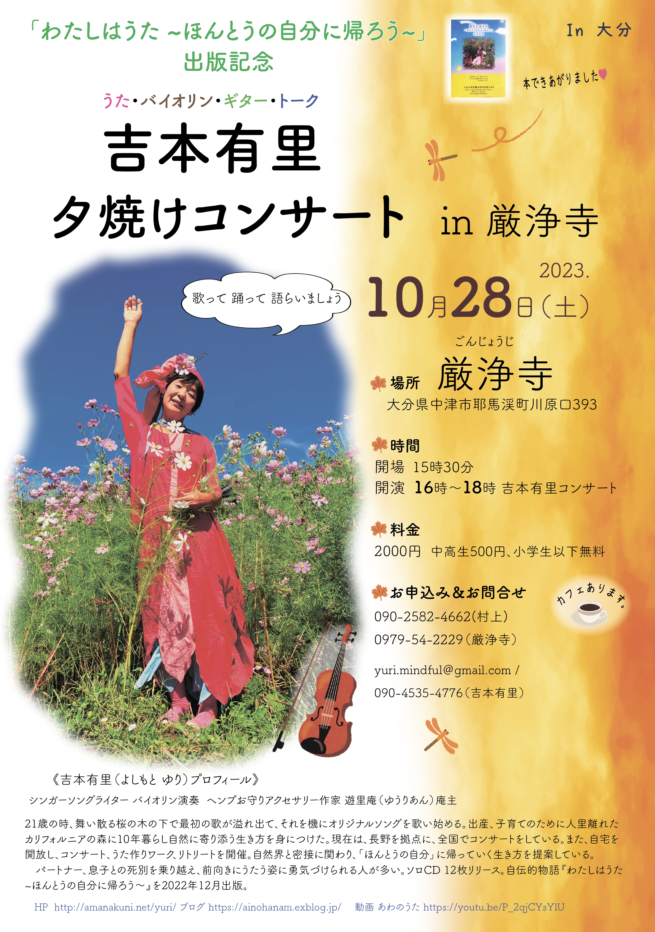 | 2023/10/28 | 大分 | 吉本有里 夕焼けコンサート In 厳浄寺 ~『わたしはうた・ほんとうの自分に帰ろう』出版記念~ チラシ 場所 厳浄寺(ごんじょうじ) 大分県中津市耶馬渓町川原口393 時間 開場 15時半 開演 16時~18時 吉本有里コンサート 料金 2,000 円 中高生 500円、小学生以下無料 お申込み&お問合せ 090-2582-4662(村上)、0979-54-2229(厳浄寺) |