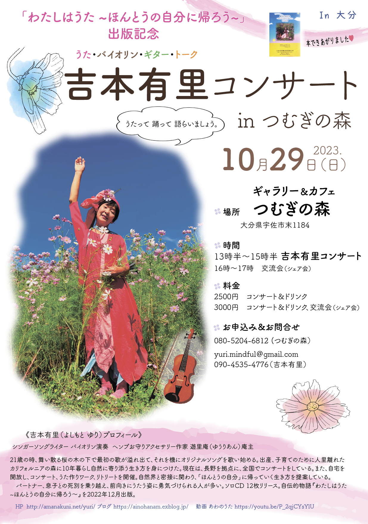 | 2023/10/29 | 大分 | 吉本有里 コンサート In つむぎの森 ~『わたしはうた・ほんとうの自分に帰ろう』出版記念~ チラシ 場所 ギャラリー&カフェ つむぎの森 大分県宇佐市末1184 時間 13時半~15時半 吉本有里コンサート 16時~17時 交流会(シェア会) 料金 2,500 円 コンサート&ドリンク / 3,000 円 コンサート&ドリンク、交流会(シェア会) お申込み&お問合せ 080-5204-6812(つむぎの森) yuri.mindful * gmail.com(*→ @) / 090-4535-4776 (吉本有里) |