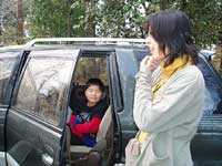 富山県砺波市の古民家「まみあな」の森満理さんに見送られる八星。この車シャリオが今は本應寺に。